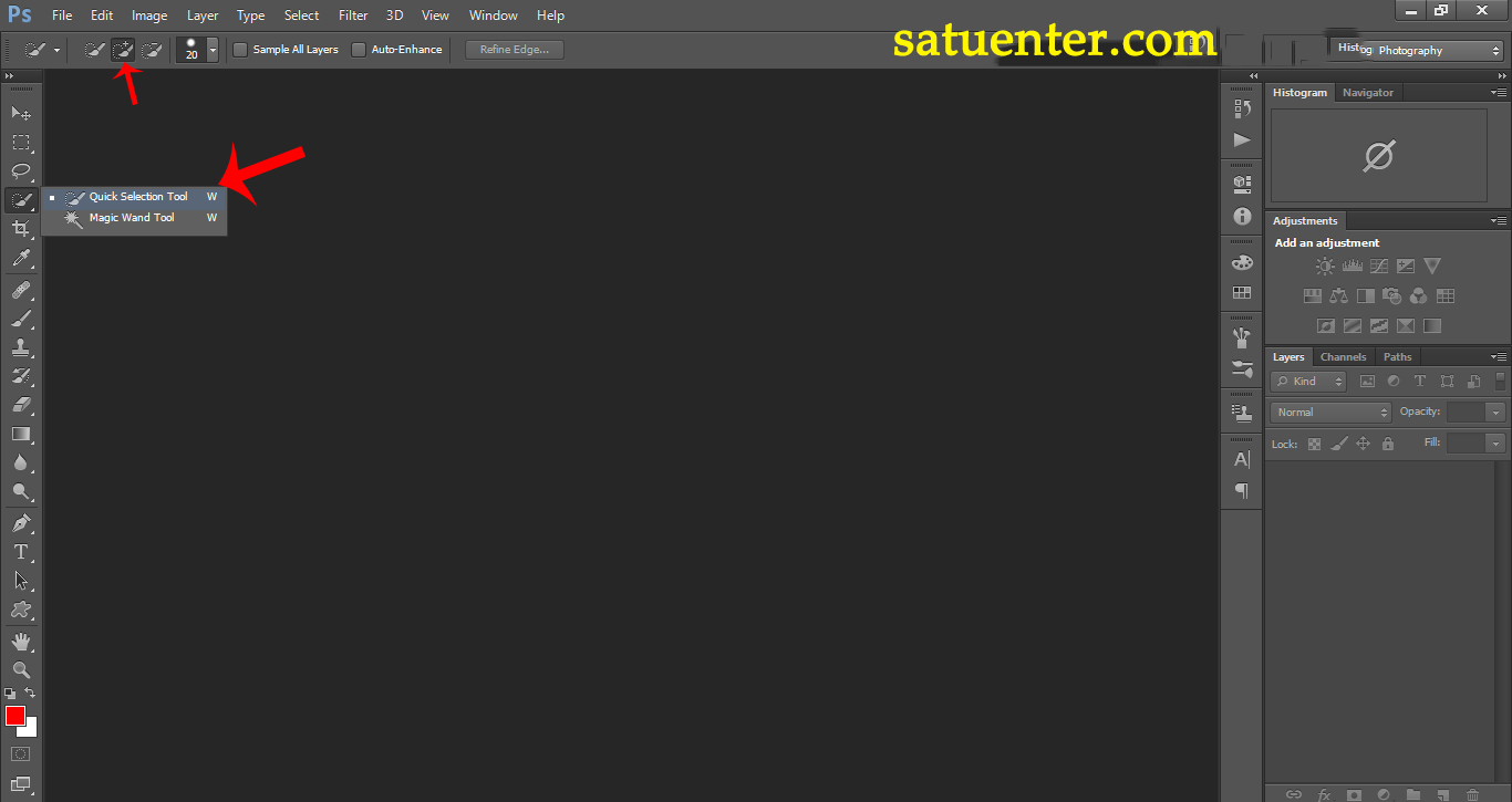 Sekarang mari kita lihat bagaimana cara mengganti background foto dengan Quick Selection Tool Photoshop ini. Silahkan buka Photoshop Anda. Biasanya Quick Selection Tool ini akan bergandengan dengan Magic Wand Tool. Coba tekan tombol W pada keyboard. Jika yang terpilih adalah Magic Wand Tool, Anda dapat klik kanan pada tool tersebut kemudian pilih Quick Selection Tool. Setelah itu pada bagian atas pilih Add to Selection (Tanda Plus)