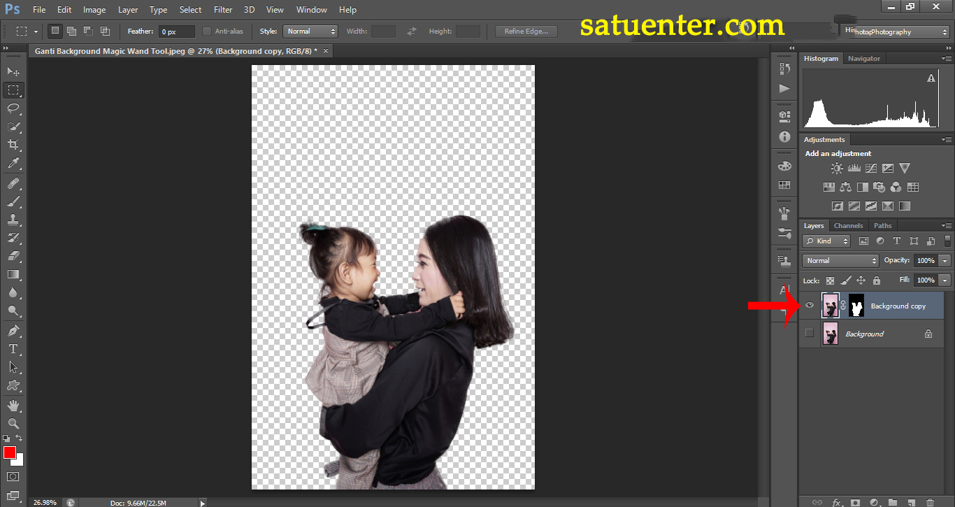 4. Setelah menekan tombol OK pada jendela Refine Edge, maka secara otomatis background sudah terhapus. Anda dapat melihatnya pada panel Layer sekarang sudah ada Layer tambahan diatas Layer Background.