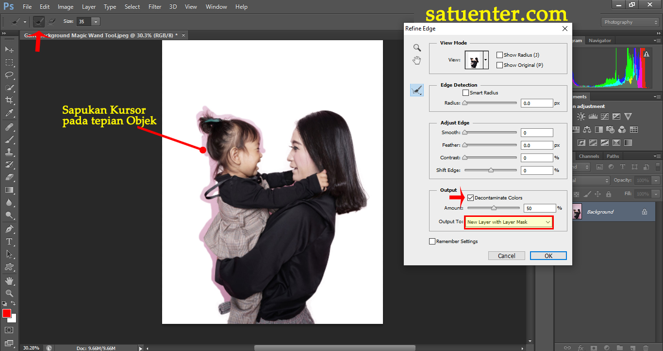 Pada kasus foto ini saya hanya melakukan sapuan kursor pada seluruh tepian objek (termasuk rambut) untuk mendapatkan hasil tepian yang lebih halus. Saya juga mengaktifkan Decontaminate Colors untuk mengurangi warna pada bagian yang terkena sapuan dan Output to-nya pada pilihan New Layer with Layer Mask