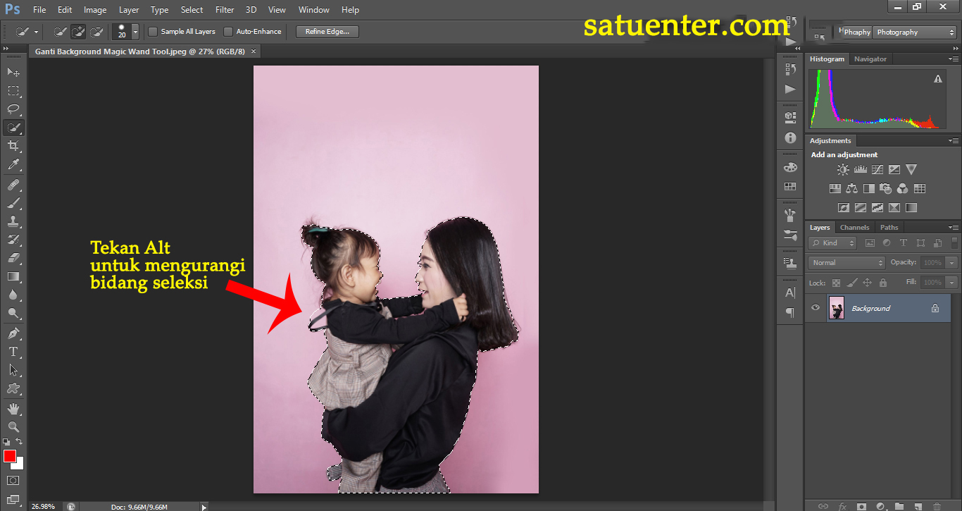 2. Untuk merapikan jika ada bagian background yang ikut terseleksi, tekan tombol Alt pada keyboard, kemudian sapukan lagi kursor pada foto untuk mengurangi bidang seleksi