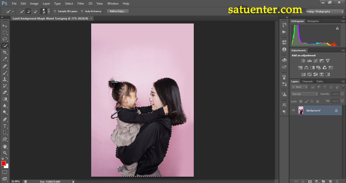 - Ukuran foto/jumlah pixel. Mungkin agak sedikit lebih sulit mengganti background dengan Quick Selection Tool ini jika ukuran foto Anda sangat kecil seperti foto dari ponsel (beberapa ponsel sudah menyediakan foto dengan resolusi besar), foto yang telah di cropping sebelumnya dan lain sebagainya.